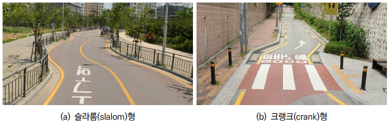 - 단 불법 주·정차 발생이 예상되는 곳은 안전지대로만 형성된 지그재그 형태의 도로는 가급적 설치하지 않음