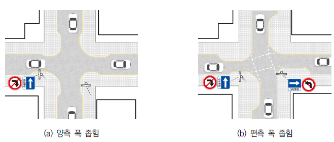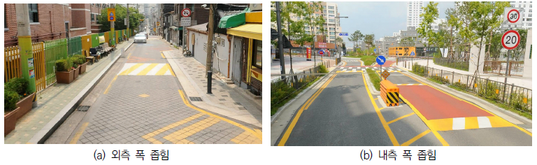 - 도로 가장자리를 좁히는 방식을 외측 폭 좁힘, 도로 중앙을 좁히는 방식을 내측 폭 좀힘이라 함