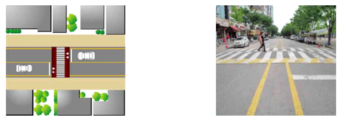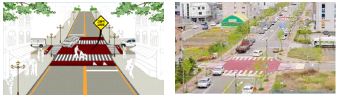 - 특히, 횡단보도에 차도폭 좁힘을 설치하게 되면 자동차가 횡단보도를 쉽게 인지할 수 있어 통행속도를