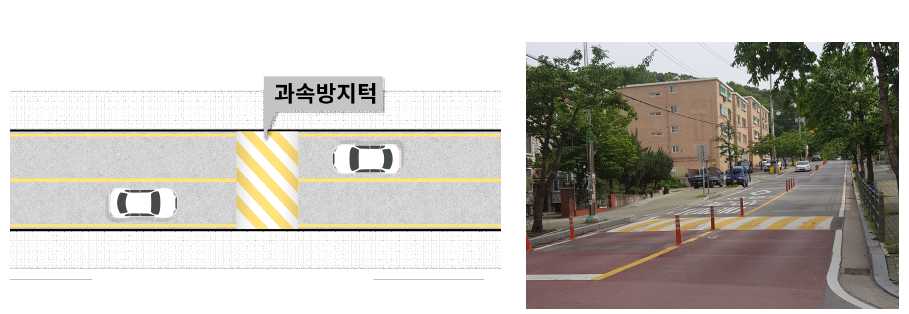 - 과속방지턱은 노면의 높이가 10cm 높아지므로 감속유도 효과가 높은 반면 소음 민원이 발생할 수 있으므로 주택가 주변 도로에 설치하는 것은 주의가 요구됨