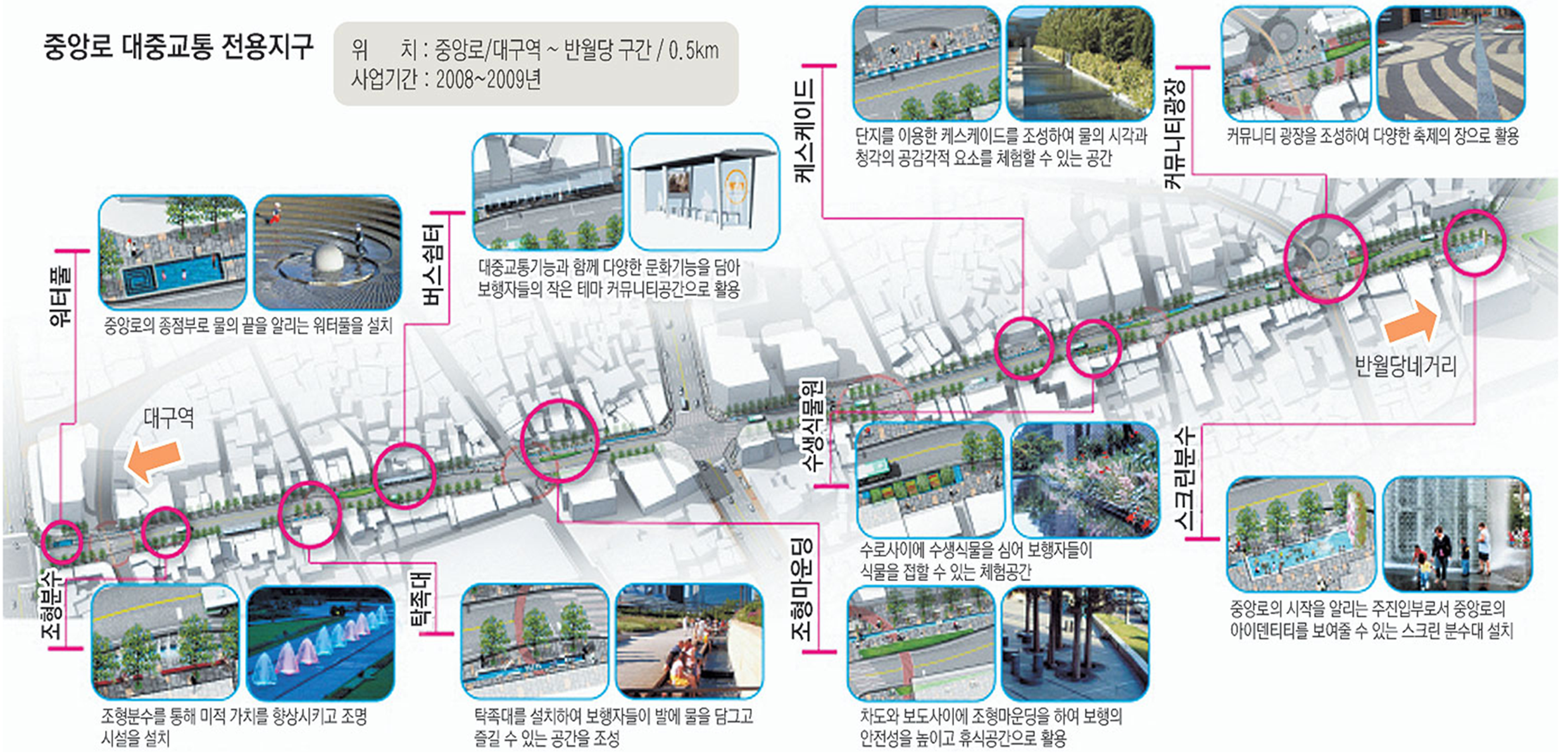 - 동천로의 역사, 문화, 고유이미지에 맞는 가로시설, 녹지시설, 조명시설, 분수시설