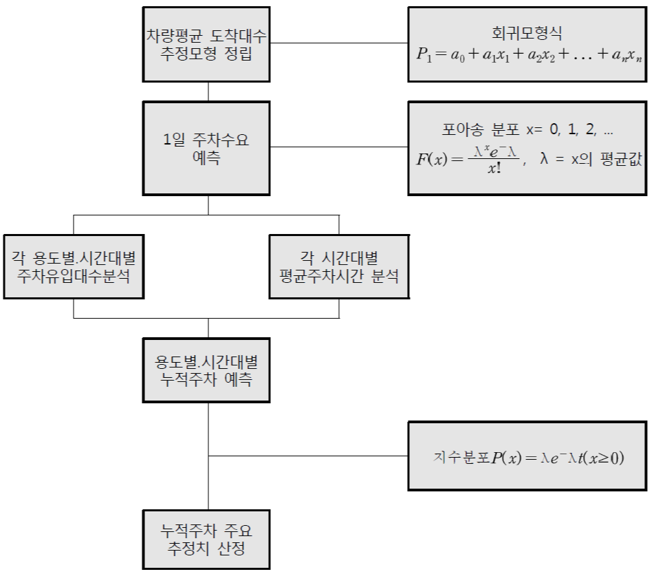 조사하고 용도별 주차특성(시간대별 도착 및 출발분포)을 산출한 다음,