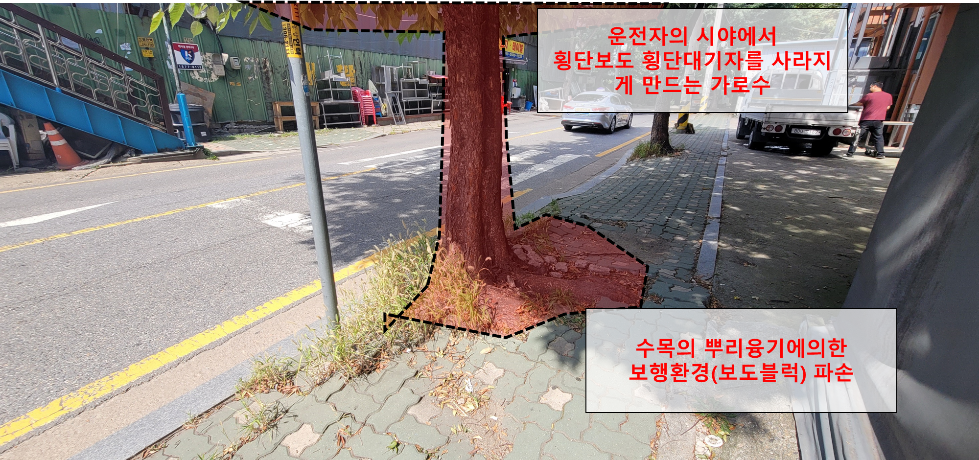 ▶ 누구를 위한 가로수인가? 보행공간을 차지하고 있는 가로수 정비를 통해 보행공간 확보가 필요하다.