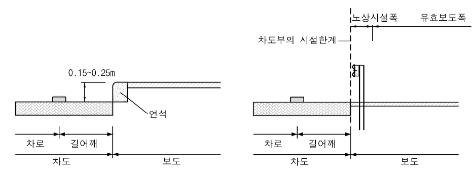 | 제16조 (보도) ① 보행자의 안전과 자동차 등의 원활한 통행을 위하여 필요하다고 인정되는 경우에는 도로에 보도를 설치해야 한다. 이 경우 보도는 연석이나 방호울타리 등의 시설물을 이용하여 차도와 물리적으로 분리해야하고, 필요하다고 인정되는 지역에는 이동편의시설을 설치해야 한다. ② 제1항에 따라 차도와 보도를 구분하는 경우에는 다음 각 호의 기준에 따른다. 1. 차도에 접하여 연석을 설치하는 경우 그 높이는 25cm 이하로 할 것 2. 횡단보도에 접한 구간으로서 필요하다고 인정되는 지역에는 이동편의시설을 설치해야 하며, 자전거도로에 접한 구간은 자동거의 통행에 불편이 없도록 할 것 ③ 보도의 유효폭은 보행자의 통행량과 주변 토지 이용 상황을 고려하여 결정하되, 최소 2m이상으로 하여야 한다. 다만, 지방지역의 도로와 도시지역의 국지도로는 지형상 불가능하거나 기존 도로의 증설·개설 시 불가피하다고 인정되는 경우에는 1.5m 이상으로 할 수 있다. ④ 보도는 보행자의 통행 경로를 따라 연속성과 일관성이 유지되도록 설치하며, 보도에 가로수 등 노상시설을 설치하는 경우 노상시설 설치에 필요한 폭을 추가로 확보해야 한다. |