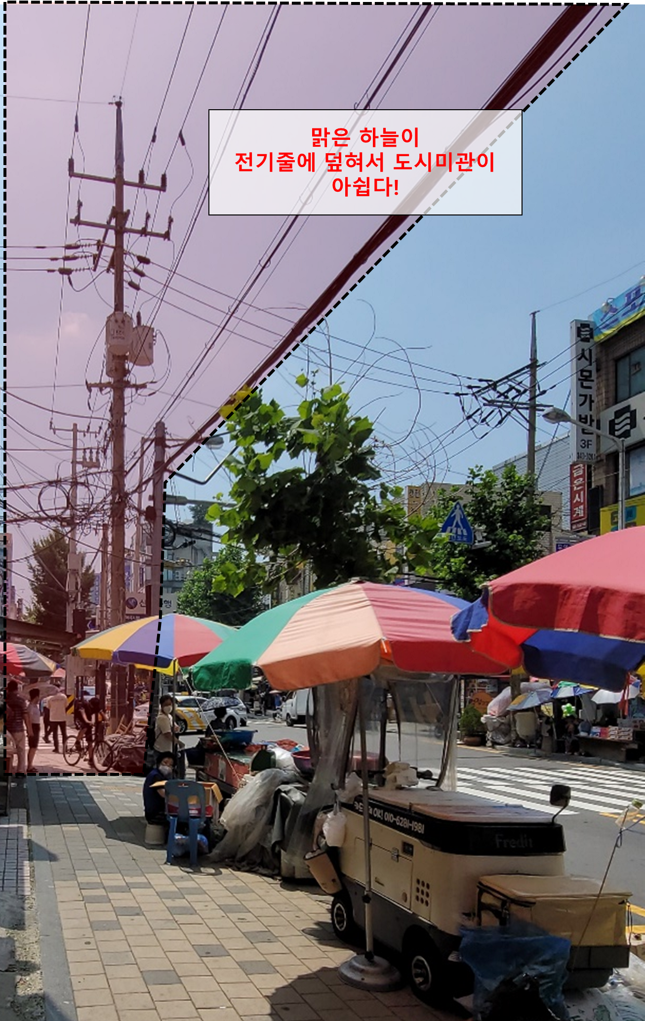 전기줄에의한 보행공간의 도시미관상으로도 좋지 않음.