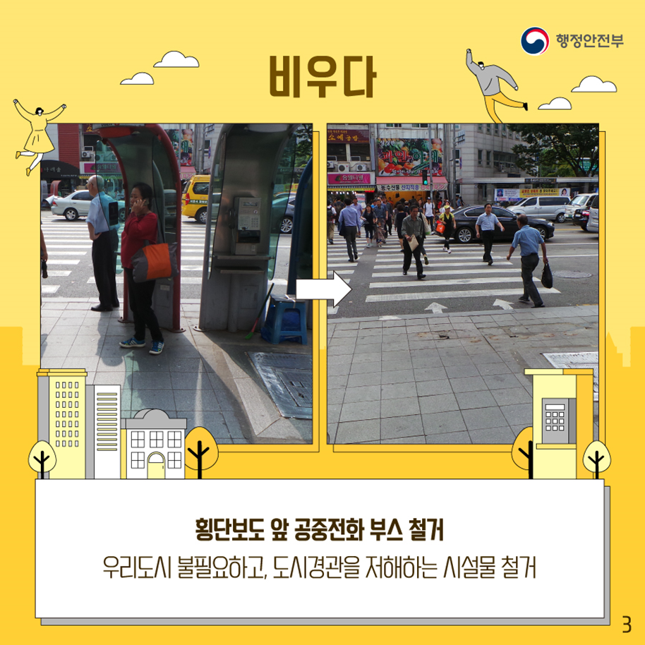 - 공중전화부스 등 효용 가치가 떨어진 시설물을 제거하여 가로시설물 최소화