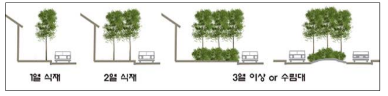 2열식재로 인해 보도폭이 협소한 경우는 2열식재를 1열식재 유형으로 변경하여 보도폭원을 확보해야함