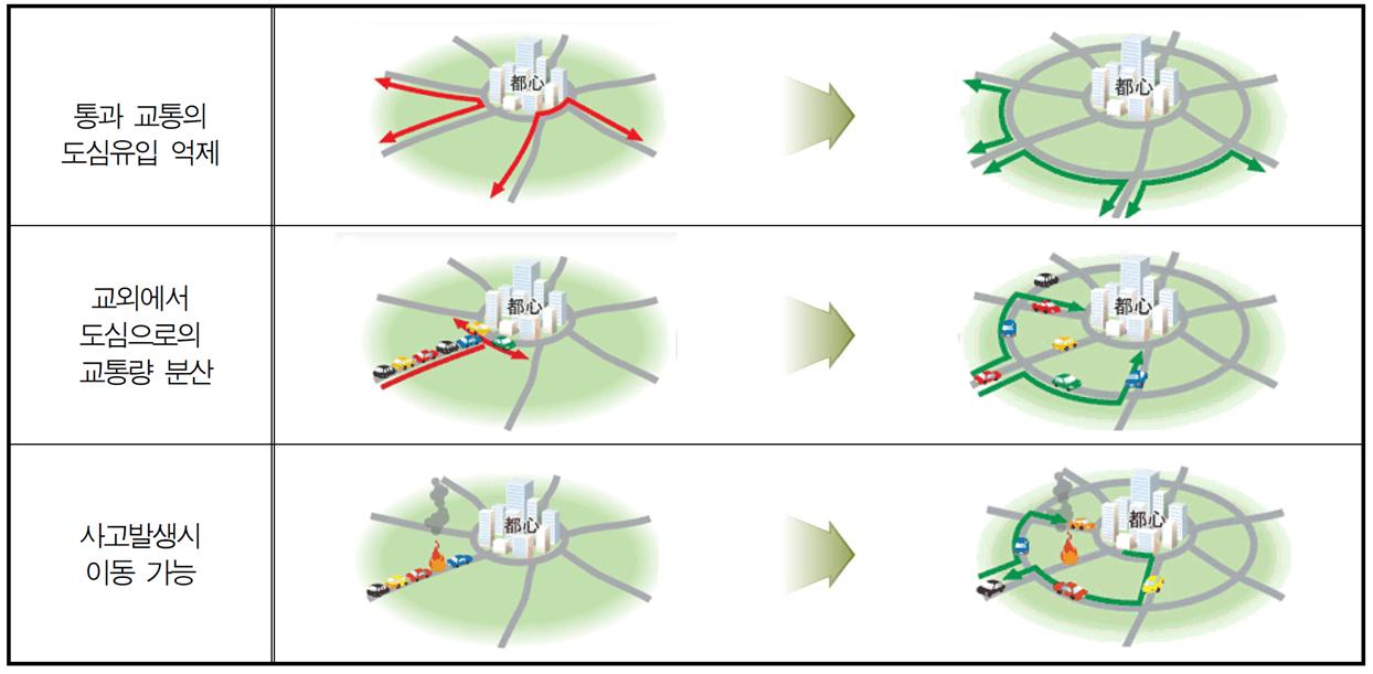- 도시 내부 통과차량의 유입을 억제함과 동시에 도시 외곽에서 도시 내로 유입하는 교통량을 분산하여 시가지 공간의 재배치 및 도시기능의 재생 촉진 역할을 하며, 도심내 일부구간 사고 및 재해로 불통구간 발생시 우회도로통행이 가능하여 신속한 이동 및 교통기능 회복이 가능